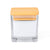 Scented candle in a transparent glass jar, square-shaped with a bamboo lid. Available in various fragrances: