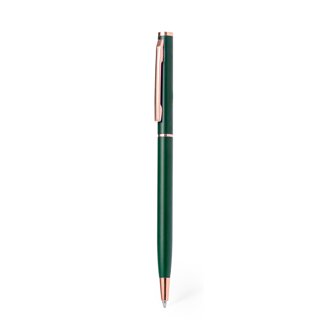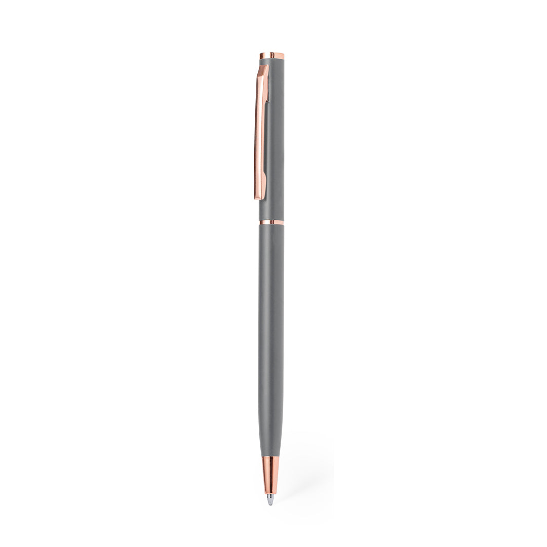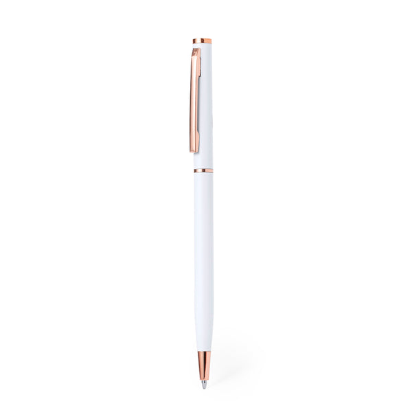 Excellent Aluminium ball pen with twist mechanism. Durable matt-finished Aluminium barrel with decorative elements in elegant copper finish, with barrel in a wide range of distinctive colours. Metal clip and blue ink. Presented in an individual recycled bag.