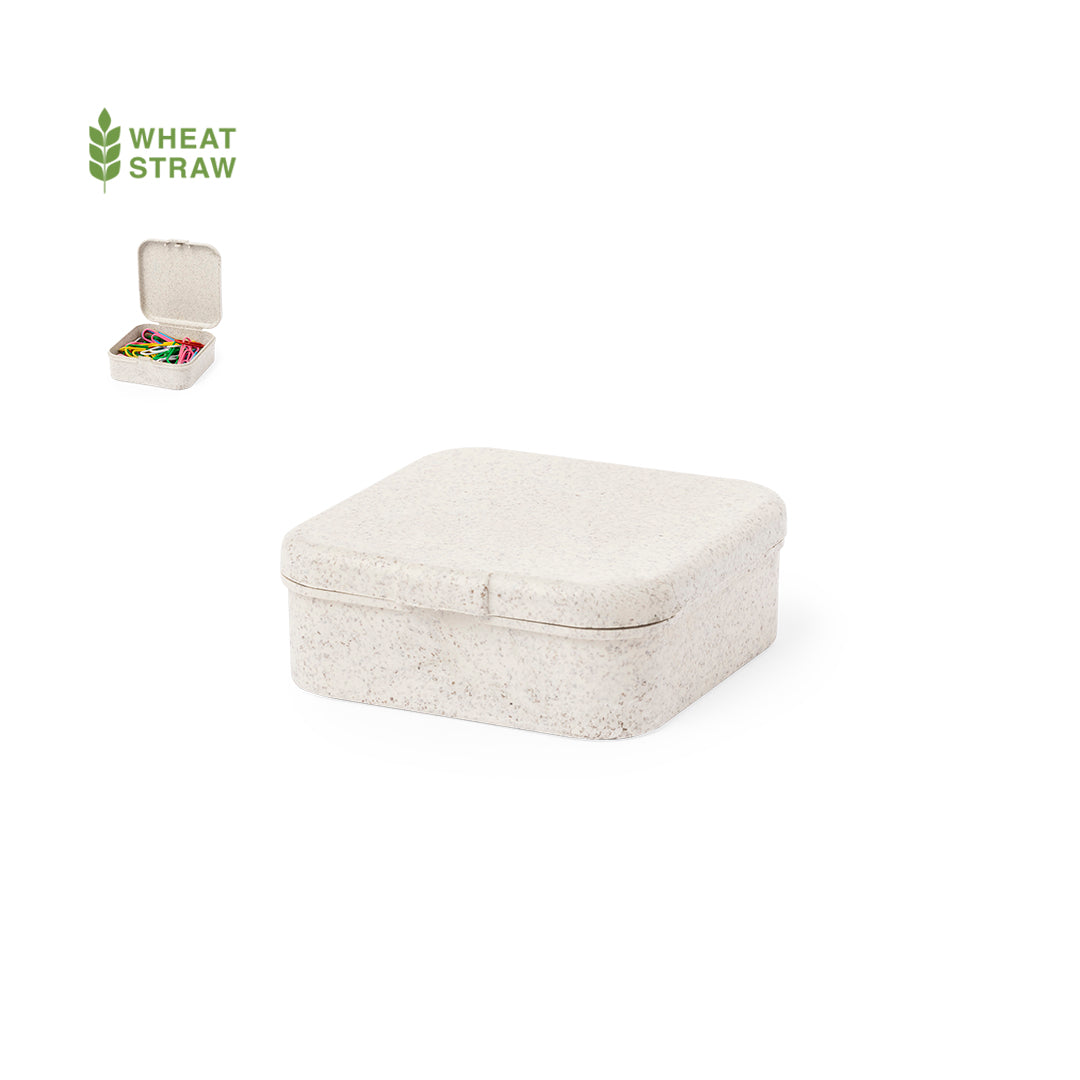 Useful clip holder made of wheat straw. With push-on closure and made from Recycled elements, with 50 clips inside.Wheat straw promotes the use of natural raw materials, thus reducing pollutant emissions.
