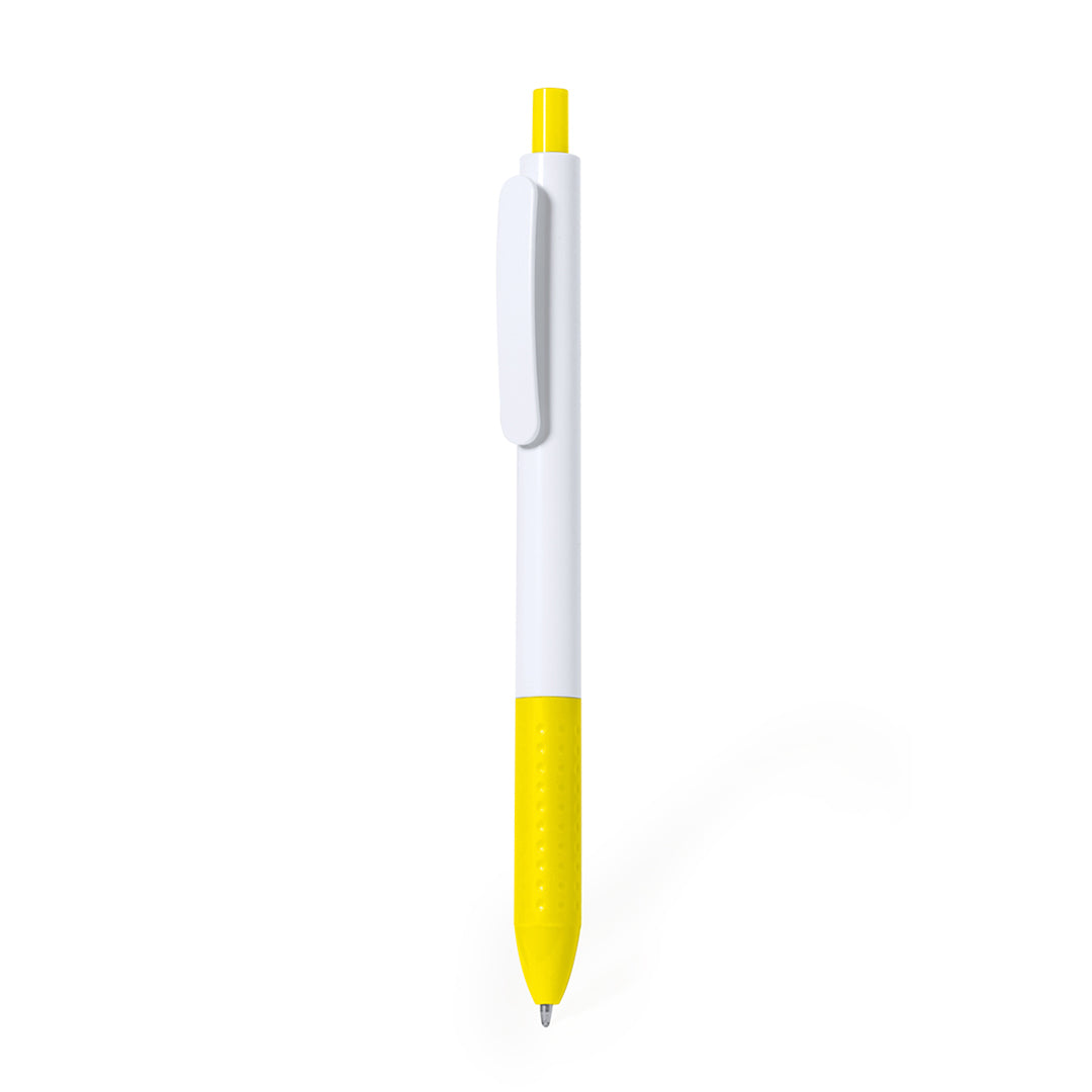 Push-button mechanism ball pen in resistant ABS. Made in an elegant combination of barrel and clip in white tones. Push button and grip available in a variety of vibrant colours. In blue ink.