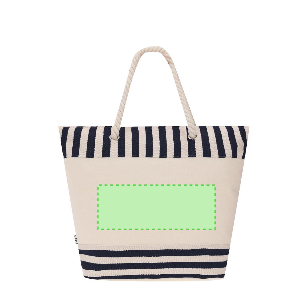 Thermal bag made of durable RPET material with aluminum interior, ideal for maintaining the temperature of food and beverages. With natural striped design matching colors. Includes zipper closure for added security and long cotton handles in rope format, reinforced with sturdy metal rings.