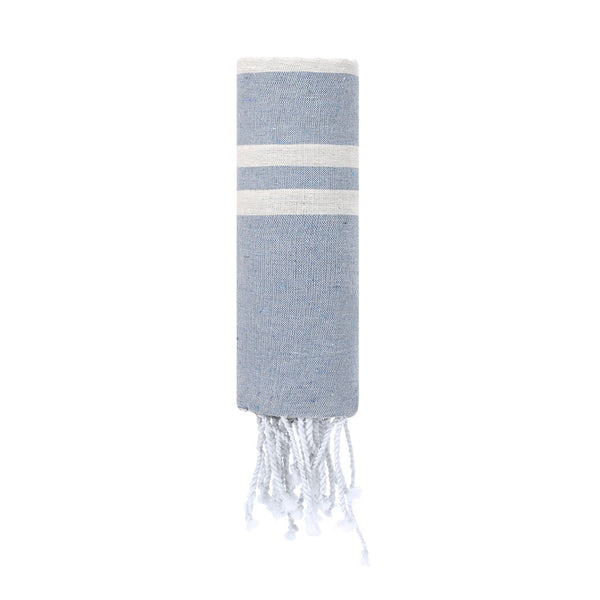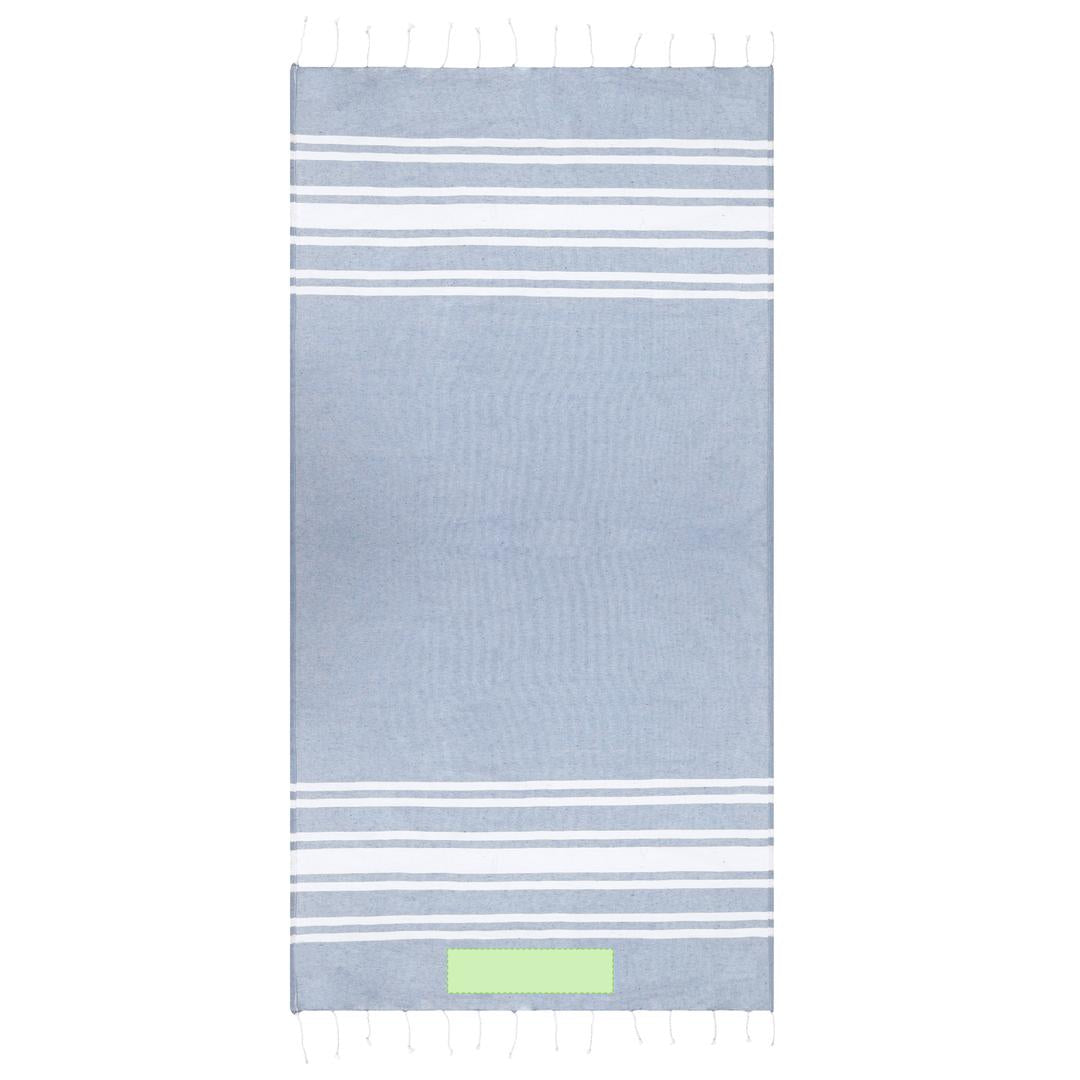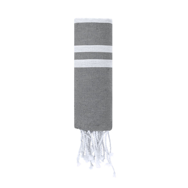 Soft pareo-towel of 150g/m2 in a combination of cotton and polyester. Its design features a colored base and white stripes. Includes fringes at the ends that add decorative detail and complete its finish.