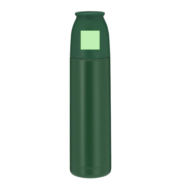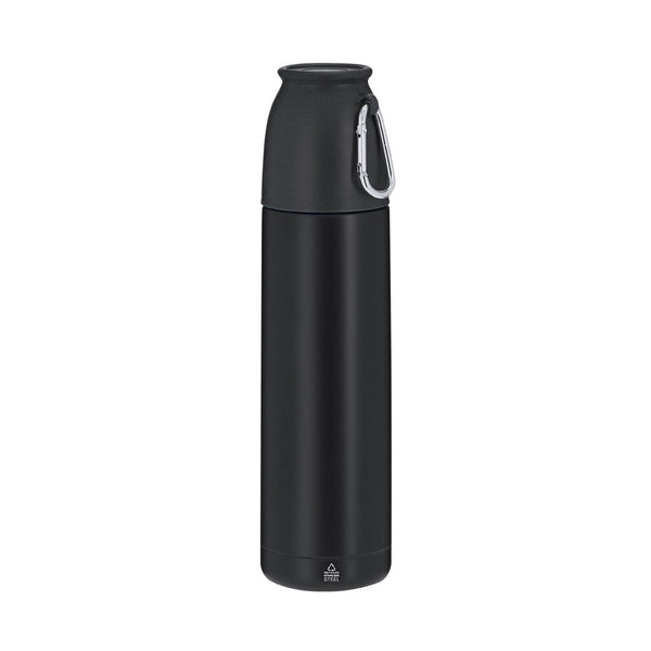 Thermal set with cup made of Recycled Stainless Steel. 500 ml capacity thermos with double wall, ensuring better and longer temperature preservation, with safety dispenser. 120ml cup, adjustable via screw and with practical transport carabiner. Thermos and cup in matching matte finish, ideal for enjoying beverages, whether hot or cold, anytime and anywhere. With Recycled Stainless Steel label.Steel is one of the most demanded materials that can be found almost everywhere, from everyday products to large constructions. With countless properties, including durability and high degree of reusability, making it a highly valued alternative in sustainability solutions. Properly treated, it allows obtaining new resources for infinite use.