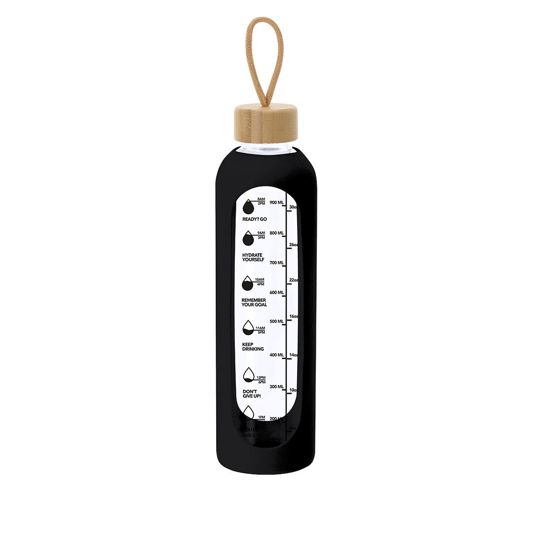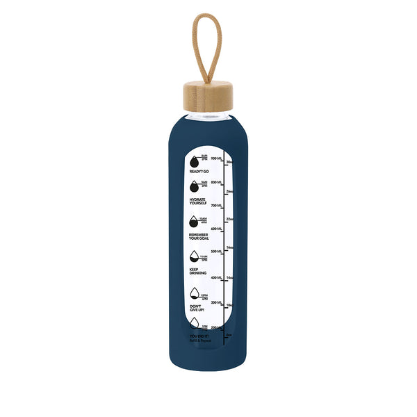 1L glass bottle designed to encourage proper hydration. Covered with a silicone sleeve that protects and provides a comfortable and secure grip. Includes capacity indicator in liters and ounces, accompanied by motivational phrases that inspire maintaining proper daily hydration. The cap, made from bamboo, includes a convenient cord for easy transport. BPA-free.