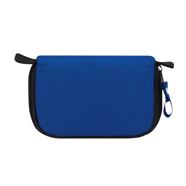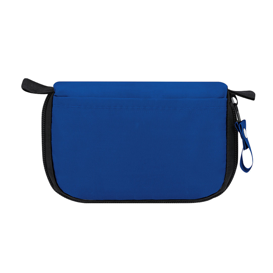 Emergency kit with 20 accessories in a sturdy 600D polyester case with single pull zipper closure. Includes sterile gauzes, bandages, alcohol towels, adhesive tape, safety pin, and scissors. With straps for hanging to facilitate better transport.