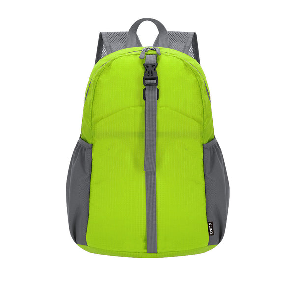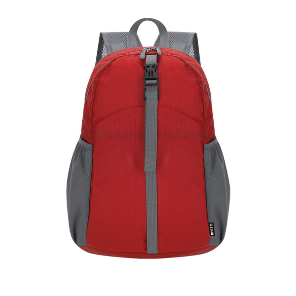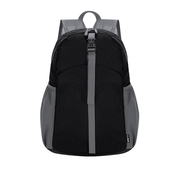 Foldable backpack made of soft RPET Ripstop 210D polyester. Main pocket with double drawstring closure, dual-function inner pocket, and front pocket with clip closure. Reinforced corners with mesh, adjustable shoulder straps, and gray accessories. Small size when folded, with a transport handle. RPET emblem on the tag.RPET material is made from recycled plastic, promoting the reuse of plastic waste and helping to sustain the planet.