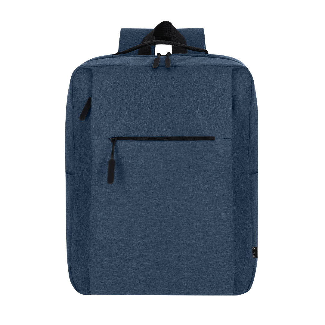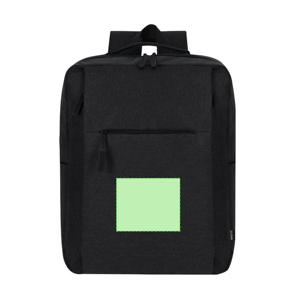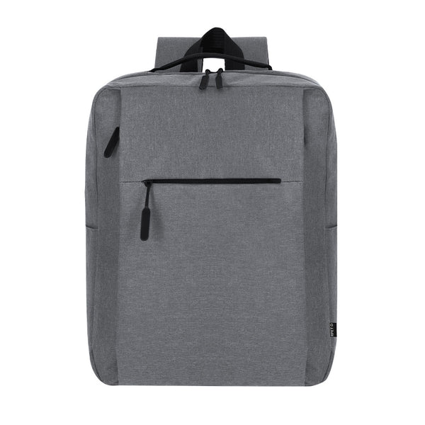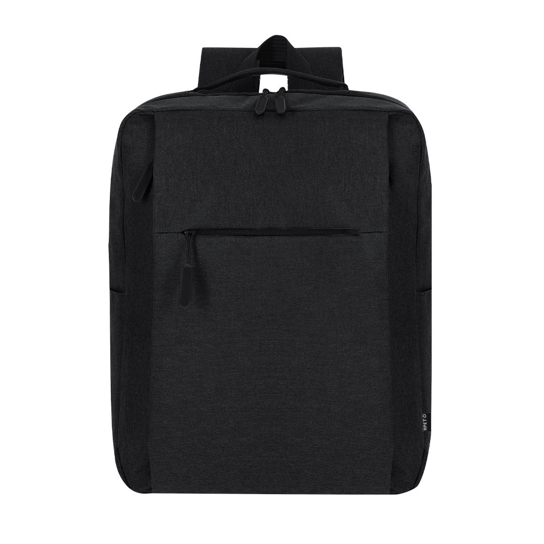 Backpack made from soft RPET 600D polyester. With a main pocket with double pull zipper closure. Interior pocket for laptops up to 15 inches. Includes two front pockets with invisible zipper closures and side pockets. Padded adjustable back and straps. Includes strap for trolley or suitcase adjustment, ideal for travel. With RPET label on the tag. The RPET material is made from recycled plastic, promoting the reuse of plastic waste and helping the planet's sustainability.