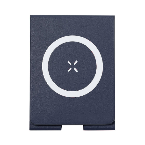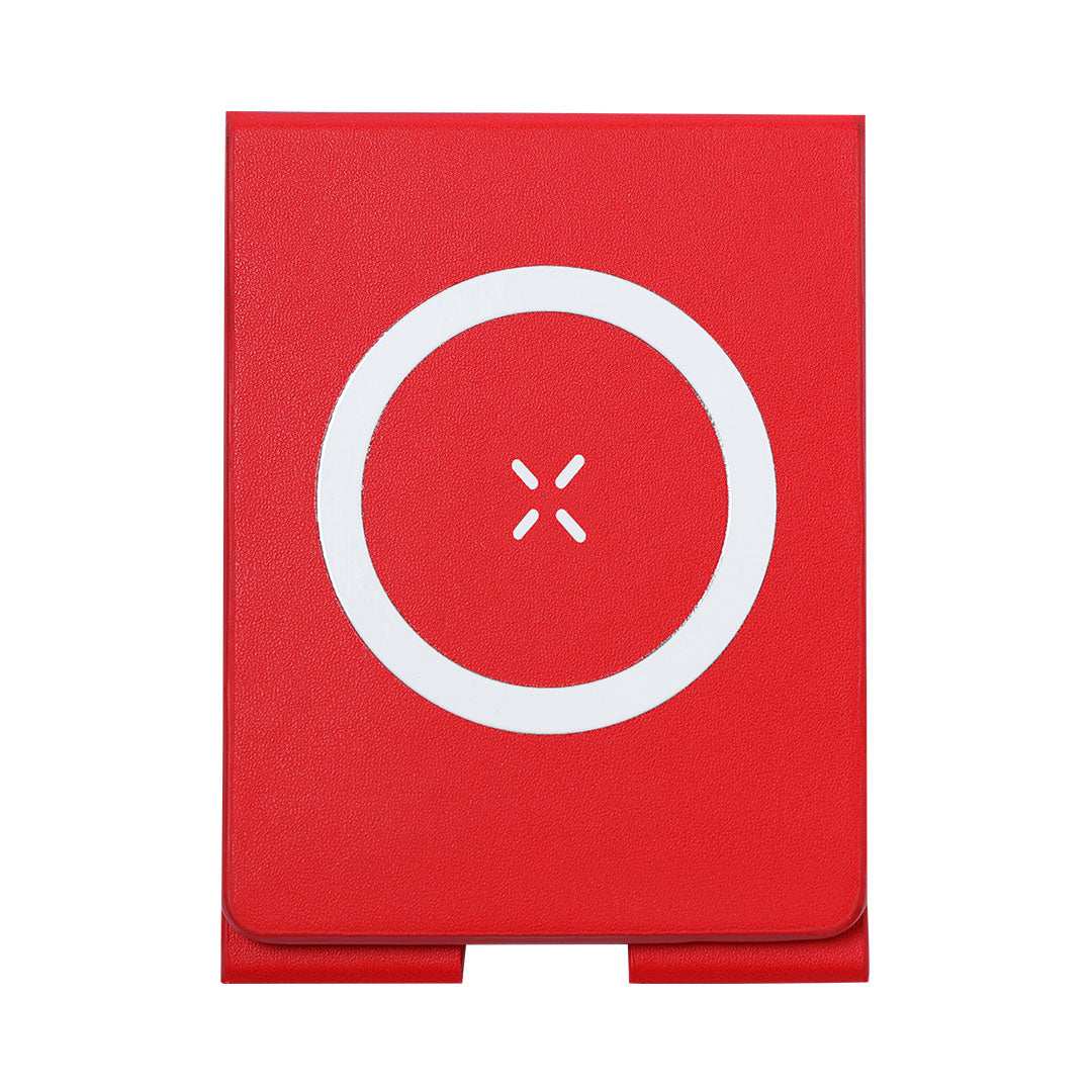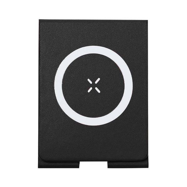 15W magnetic wireless charger, made from PU. Includes a foldable stand, with the possibility of several smartphone positions, and a charging status indicator. Compatible with devices equipped with wireless charging technology. Includes 1m USB charging cable, with Type C input connector, and a metallic ring with adhesive. User manual available in Spanish and English.