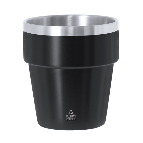 Thermal cup made from recycled stainless steel with double wall and 250 ml capacity. Coating in satin color and edge and interior in satin stainless color. With recycled stainless steel logo.Stainless steel is one of the most demanded materials and can be found almost everywhere, from daily use products to large constructions. With countless properties, including durability and a high degree of reuse, making it a highly valued alternative in sustainability solutions. Properly treated, it allows for obtaining new resources of infinite use.