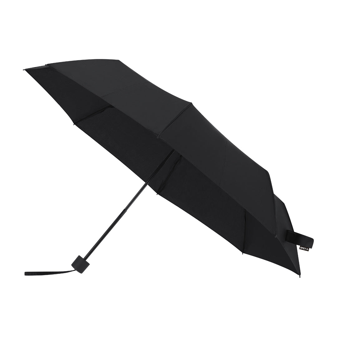 Set of umbrella and bag made of RPET. Umbrella with practical bag with 2-1 functionality. Folding umbrella with 100cm diameter. In 190T RPET pongee material and soft black ABS handle with wrist strap for added safety. Manual opening, with windproof system and black fiberglass rods. With distinctive RPET label. Bag made of RPET Pongee 190T, with pocket on the side. Rain resistant. With metallic zipper to store the umbrella and keep the contents of the bag dry. It offers a practical and versatile solution for rainy days, when not in use it rolls up acting as an umbrella cover. With distinctive RPET label.