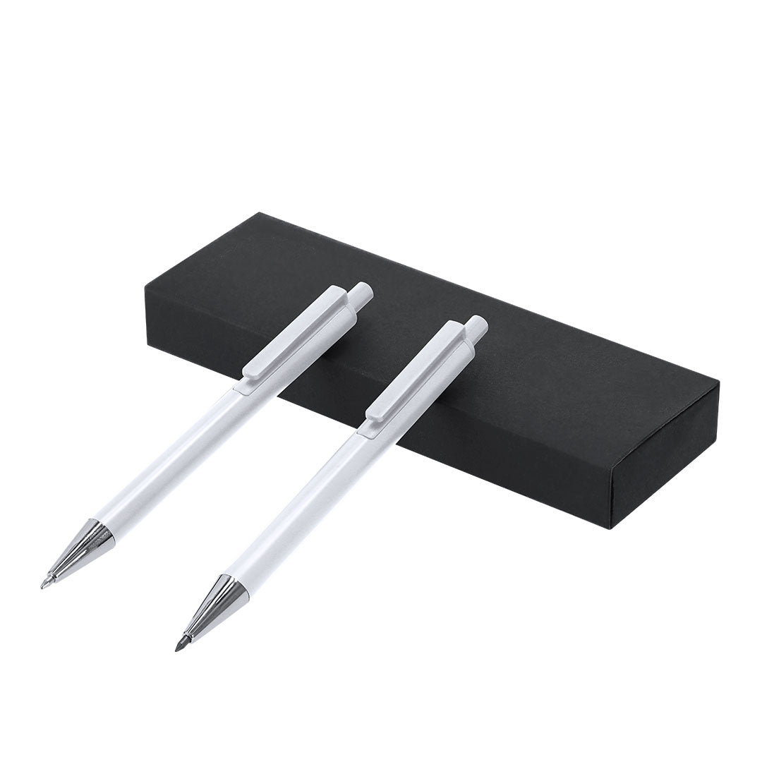 Set composed of a blue ink pen and an eternal pencil, made of Recycled Aluminum. The eternal pencil offers continuous writing, avoiding generating waste. Both have a push-button mechanism. Designed with matching clip and chrome details. Presented in a black recycled cardboard case. With AL Recycled badge printed.