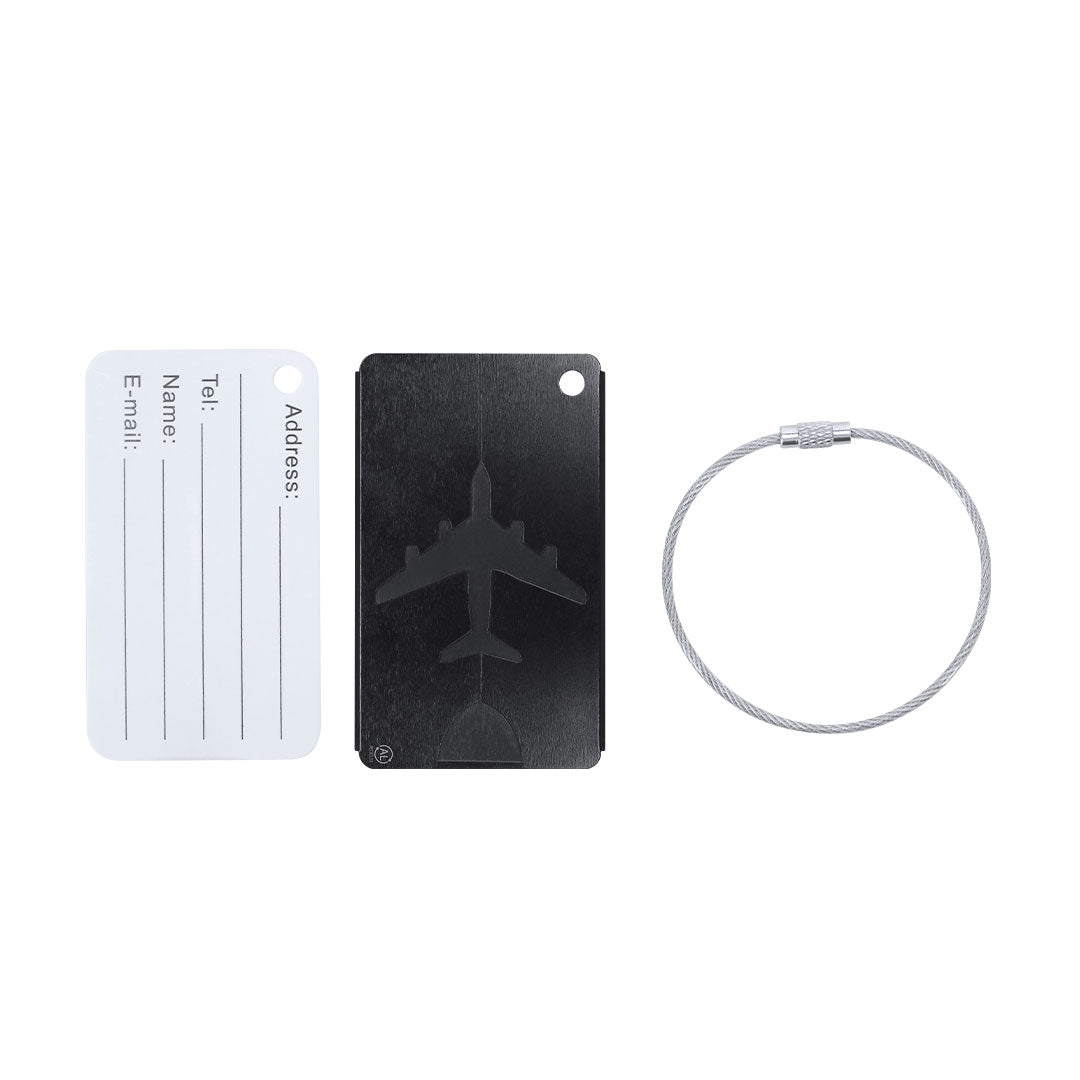 Original suitcase identifier with airplane design in resistant Recycled Aluminum. With stainless steel coupling tape with screw closure system and identification card in English with the following printed fields; Addres, Tel, Name, E-mail. AL Recycled logo laser engraved.