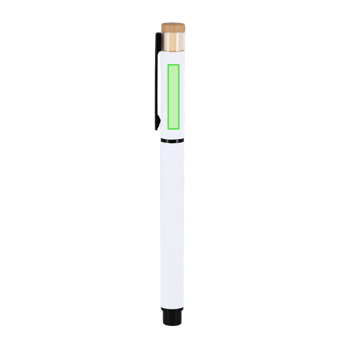 Elegant roller made of bamboo and Recycled Aluminum. With a rubbery finish body. Black clip and grip. With jumbo cartridge, in blue ink and with hood closure. With distinctive Recycled Aluminum logo.