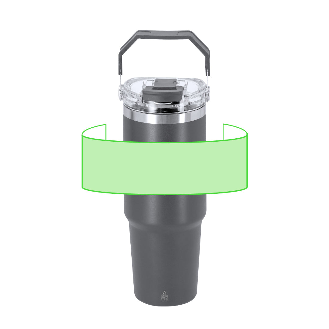 Thermal vessel with 900 ml capacity with double wall. Made of recycled stainless steel. It has a double drinking system: hole with hermetic closure and integrated straw, adapting to usage preferences. With hermetic sealing system lid. Includes practical carrying handle, ideal for easy transport in any situation. BPA free. With Recycled Stainless Steel badge.