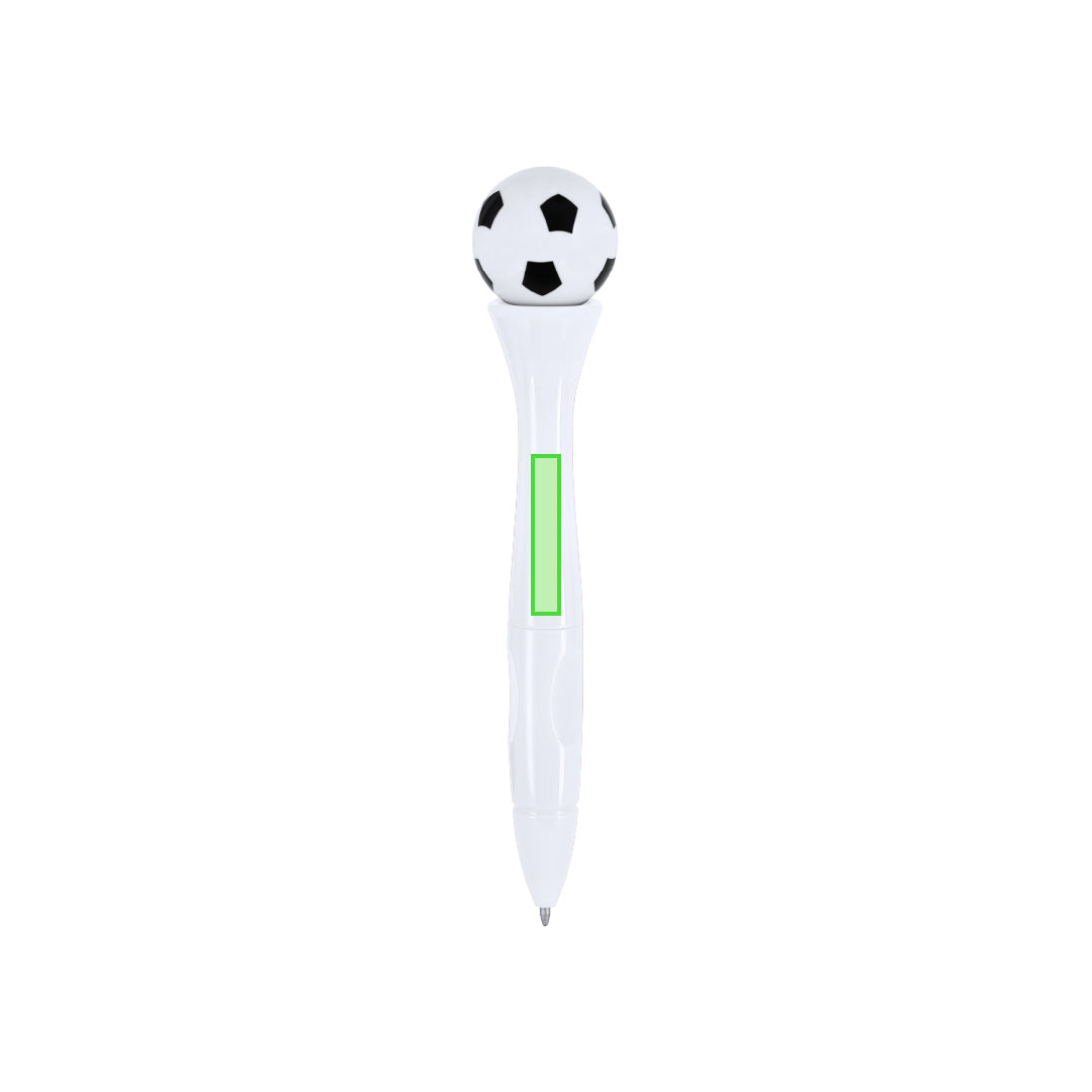 Anti-stress pen with rotating mechanism and soccer ball design. Body in glossy solid finish. With blue ink.