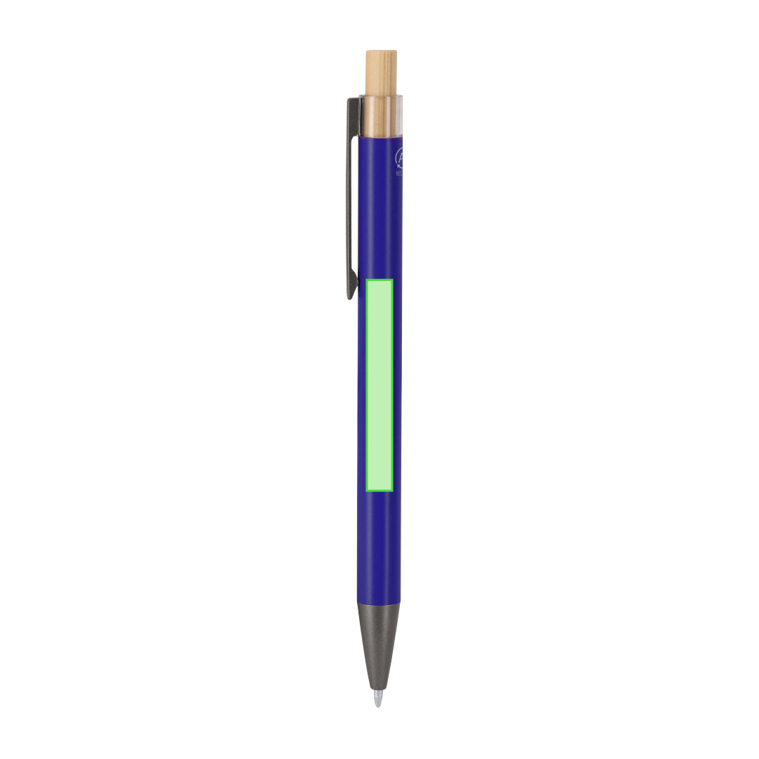 Push-button pen made of recycled aluminum. Bamboo push button with matte gray body. Black clip and tip. Jumbo charging and in blue ink.