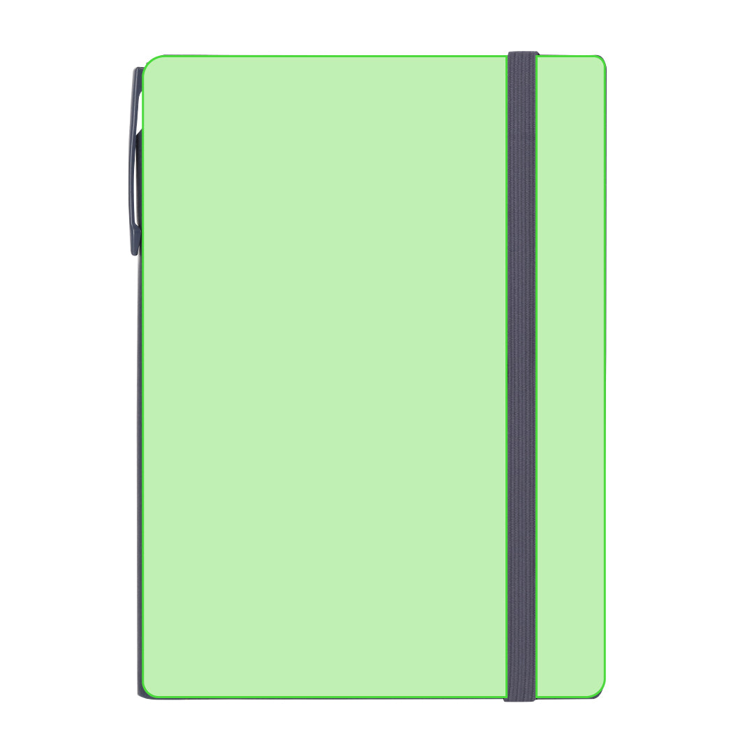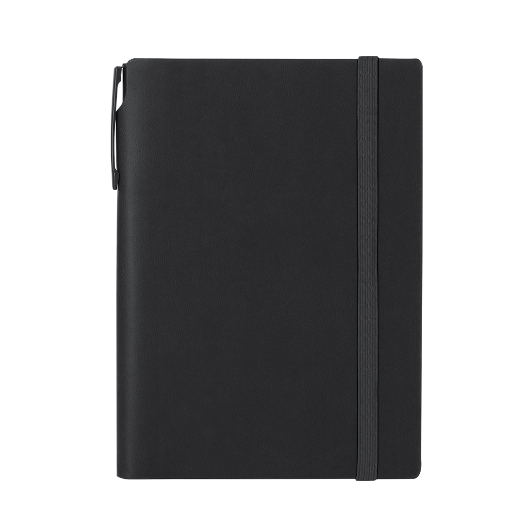 Set of notepad and pen made of recycled PU and Recycled Aluminum. The set includes: - Notepad made of recycled PU. Hard covers, includes 96 cream-colored pages, bookmark, and matching elastic closure ribbon. With recycled PU logo badge. - Pen made of recycled Aluminum, with a solid color body in rubber finish. It has a clip, push-button mechanism and blue ink. Includes logo badge in recycled aluminum.The pad has a space to store the pen so you can carry everything in one place.