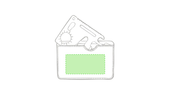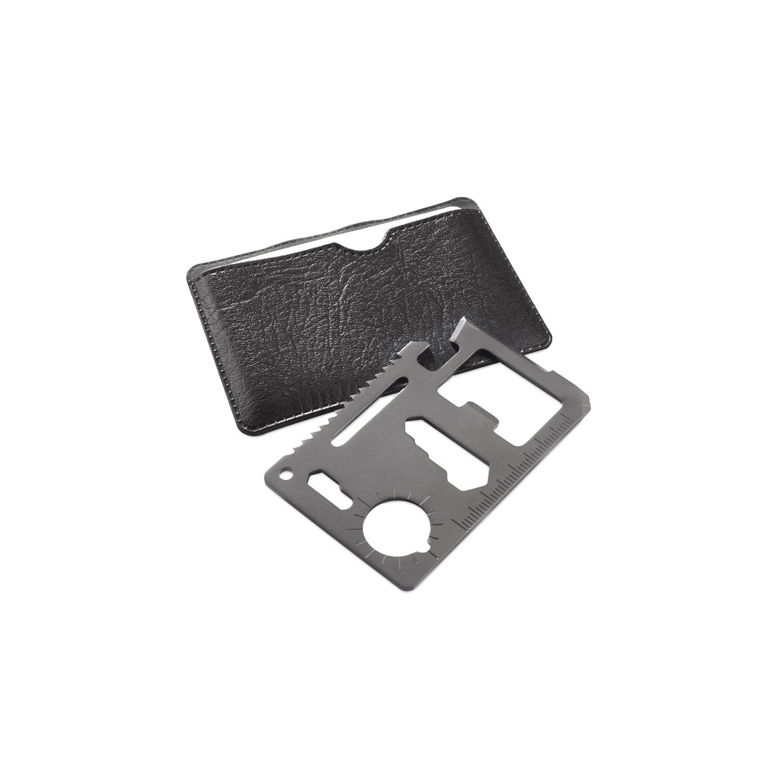 Multi-tool with resistant stainless steel body with 11 functions. With can opener, knife, screwdriver, ruler, bottle opener, bottle opener, spanners, butterfly keys, saw and direction indicator. Presented in resistant leather case.