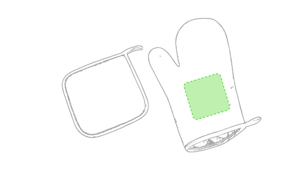 Kitchen set with handle and mitten in TC material -combination of cotton and polyester-. In a varied range in bright tones with white color inside. With a plain side especially designed for printing and hanging strap.