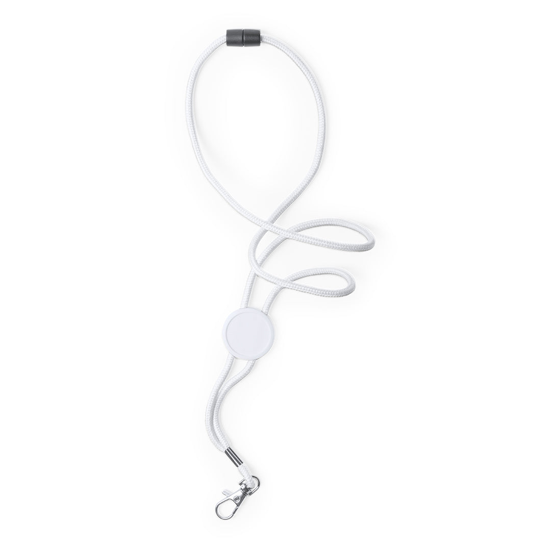 Lanyard in resistant and soft polyester string in a varied range of bright tones. With detachable snap closure on collar, metal carabiner accessory and central pad for printing.