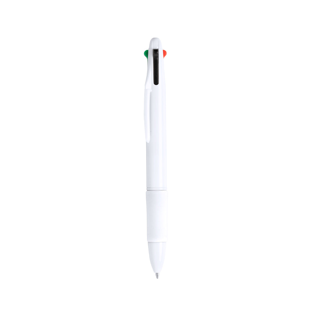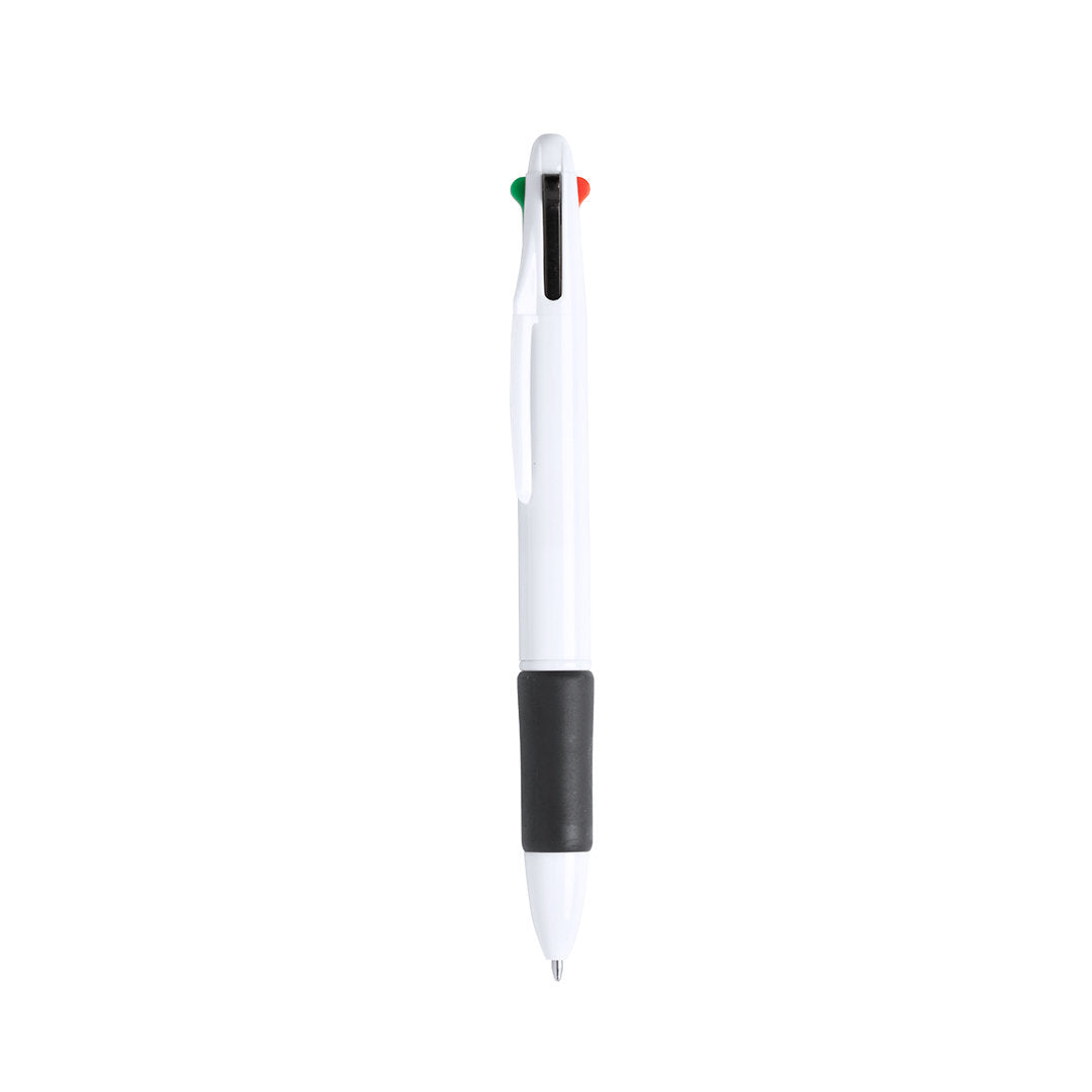 Ball pen 4-in-1 with retractable push-up mechanism, classic design and solid color body in white. Soft-touch, color grip in bright tones. 4 cartridges in blue, red, black and green ink.