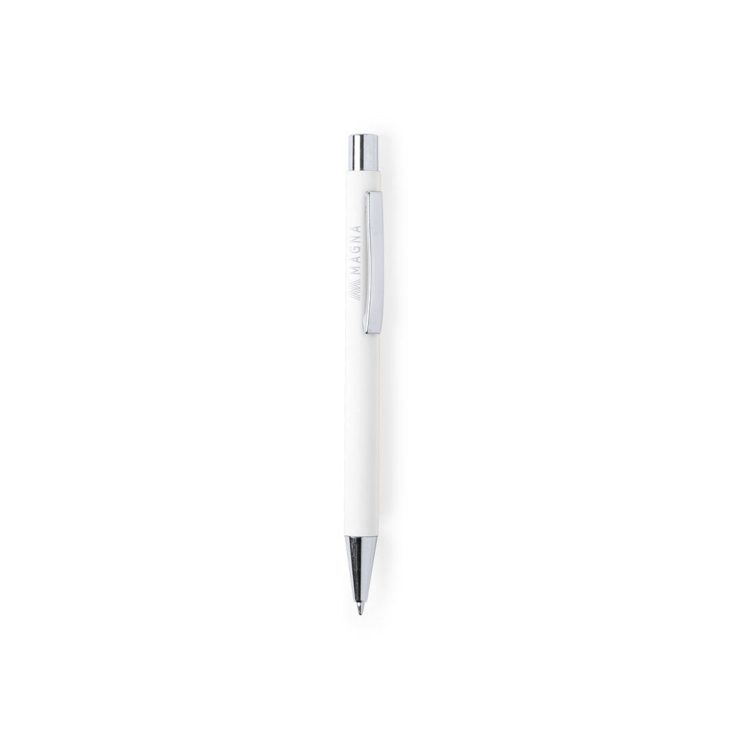 Ball pen with push-up mechanism in an elegant two color design. Aluminum body with rubber finishing, especially designed for laser printing, showing the logo in silver tone. Chromed tip and pusher, with metal clip. Available in a wide range of colors, with jumbo cartridge and blue ink refill.