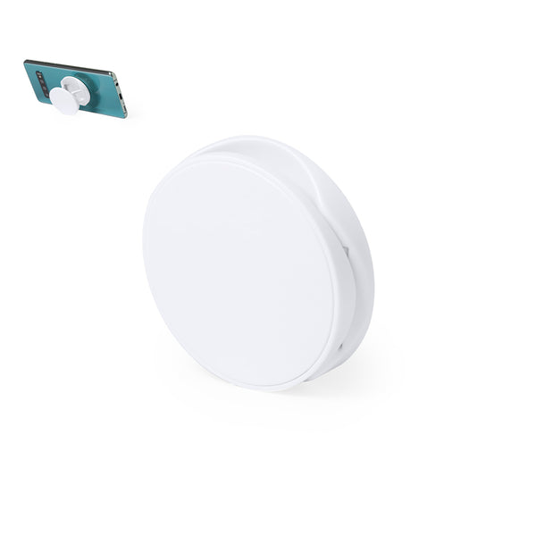 Folding holder for smartphone in an elegant, white color design. Especially designed for pad printing, with 3M adhesive tape, extra strong fixation and residue free when detached from the device.