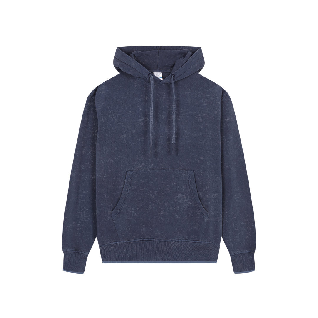 Unisex hooded sweatshirt with washed jeans effect, making each piece unique and unrepeatable. Kangaroo pocket, with extra wide elastic bands for a perfect fit. Contrast color in the elastic bands of cuffs and hem. Made in 100% combed cotton 280g/m2. Soft touch and modern cut, with adjustable flat strings and embroidered eyelets, avoiding the use of metal. Double stitching for durability and resistance to intensive wear. Easily removable label and available in sizes XS, S, M, L, XL and XXL.