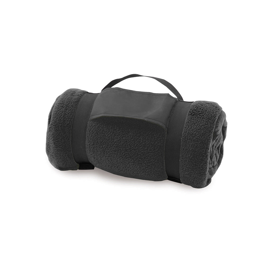 Blanket 130x160cm in a varied range of bright tones. In polar fleece material of 200g/m2 with anti-pilling treatment and carrying handle with velcro closure in soft polyester.